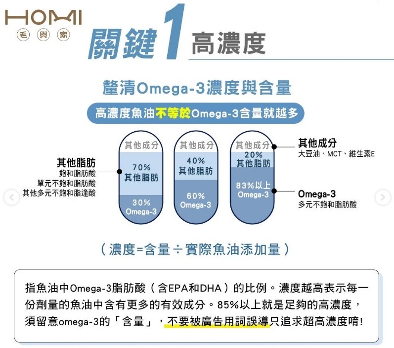 選擇魚油產品時,毛主人可能會看到各種標籤和數據,如「高濃度」、「高純度」、「Omega-3」、「EPA」、「DHA」等。這些概念的具體意義是什麼?對選擇魚油有什麼幫助?